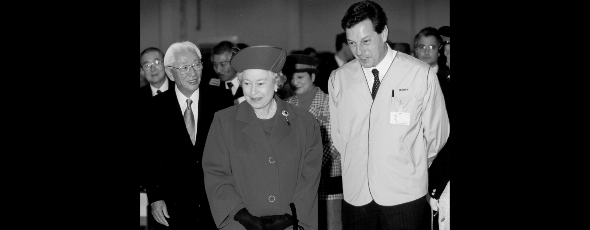 Her Majesty Queen Elizabeth II at the Sony Pencoed Opening Ceremony in 1993, alongside Sony co-founder, Akio Morita
